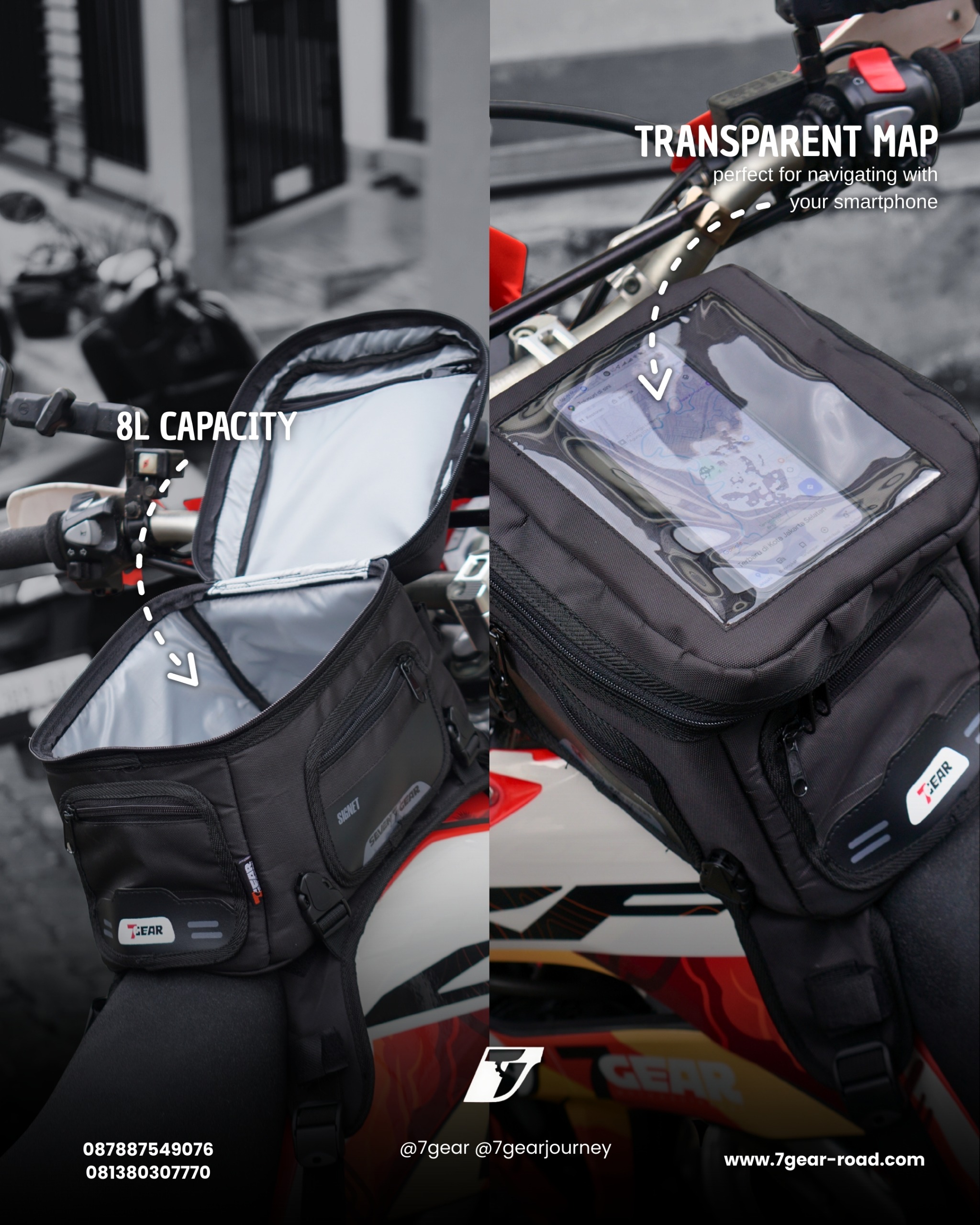 Produk 7Gear dikhususkan untuk motor bertanki plastik/kondom, berkapasitas 8 liter memiliki kompartemen yang lumayan untuk menyimpan jas hujan, terdapat sekat/atau pemisah yang bisa dibongkar pasang. tersedia juga saku jaring pada bagian belakang dan di bagian dalam tas.