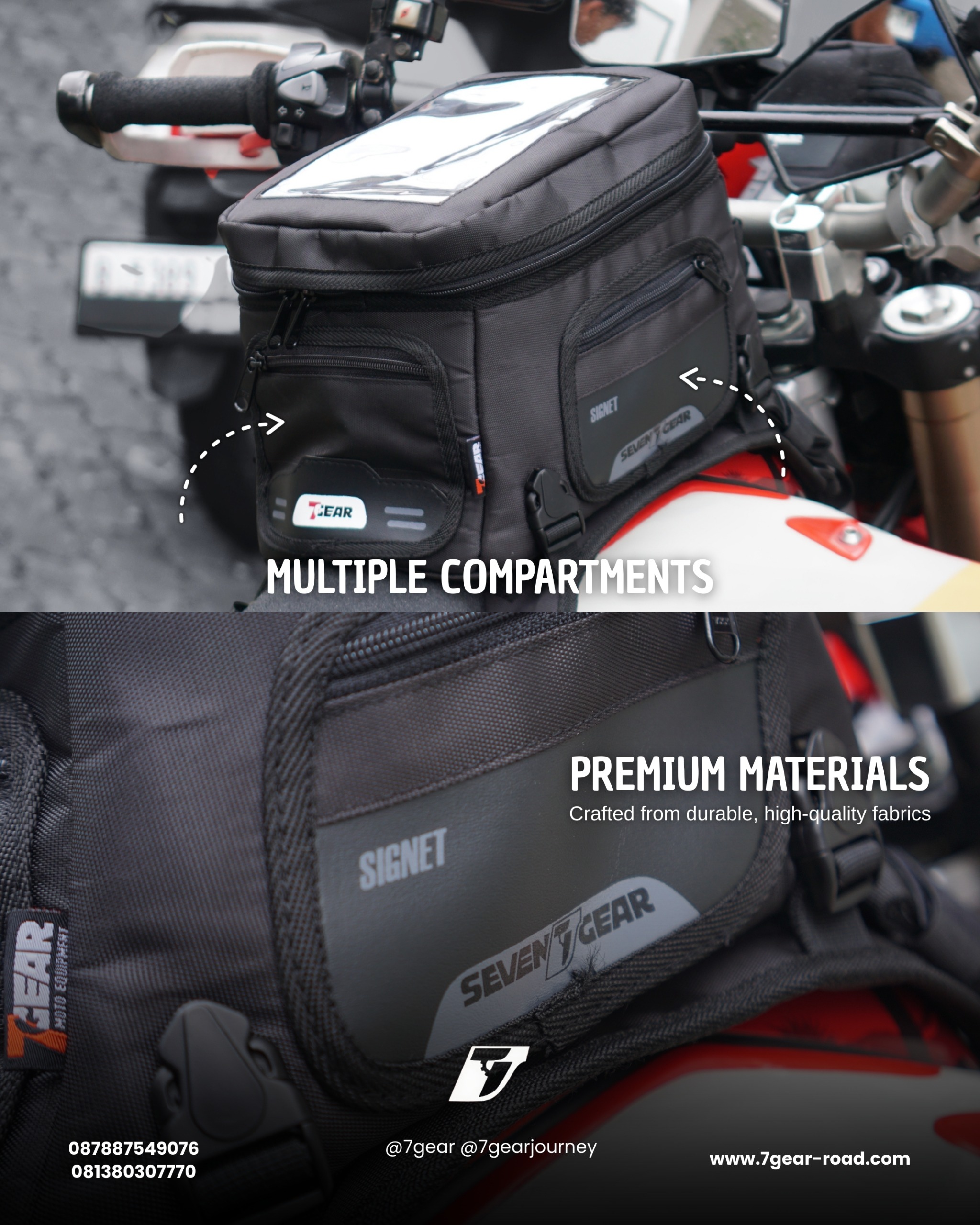 Signet Tankbag ini dapat dijadikan tas selempang, Material bagian bawah menggunakan bahan Lexter yaitu jenis material yang 80% terbuat dari bahan karet untuk menjaga supaya tangki terhindar dari goresan. Untuk pemakaian di musim hujan pun tidak perlu khawatir karena sudah disediakan raincover .